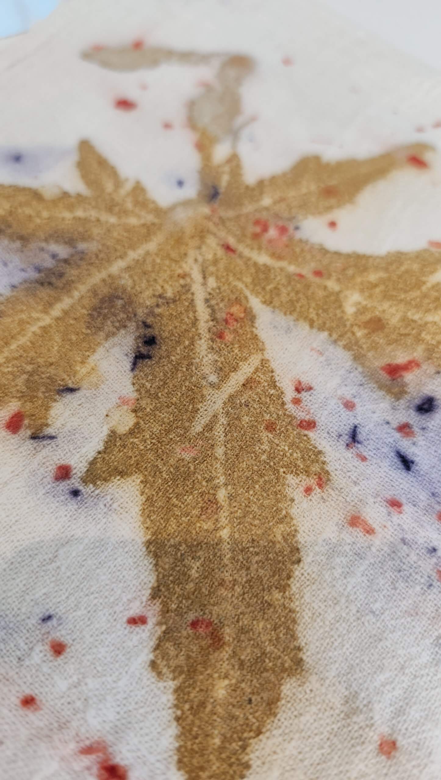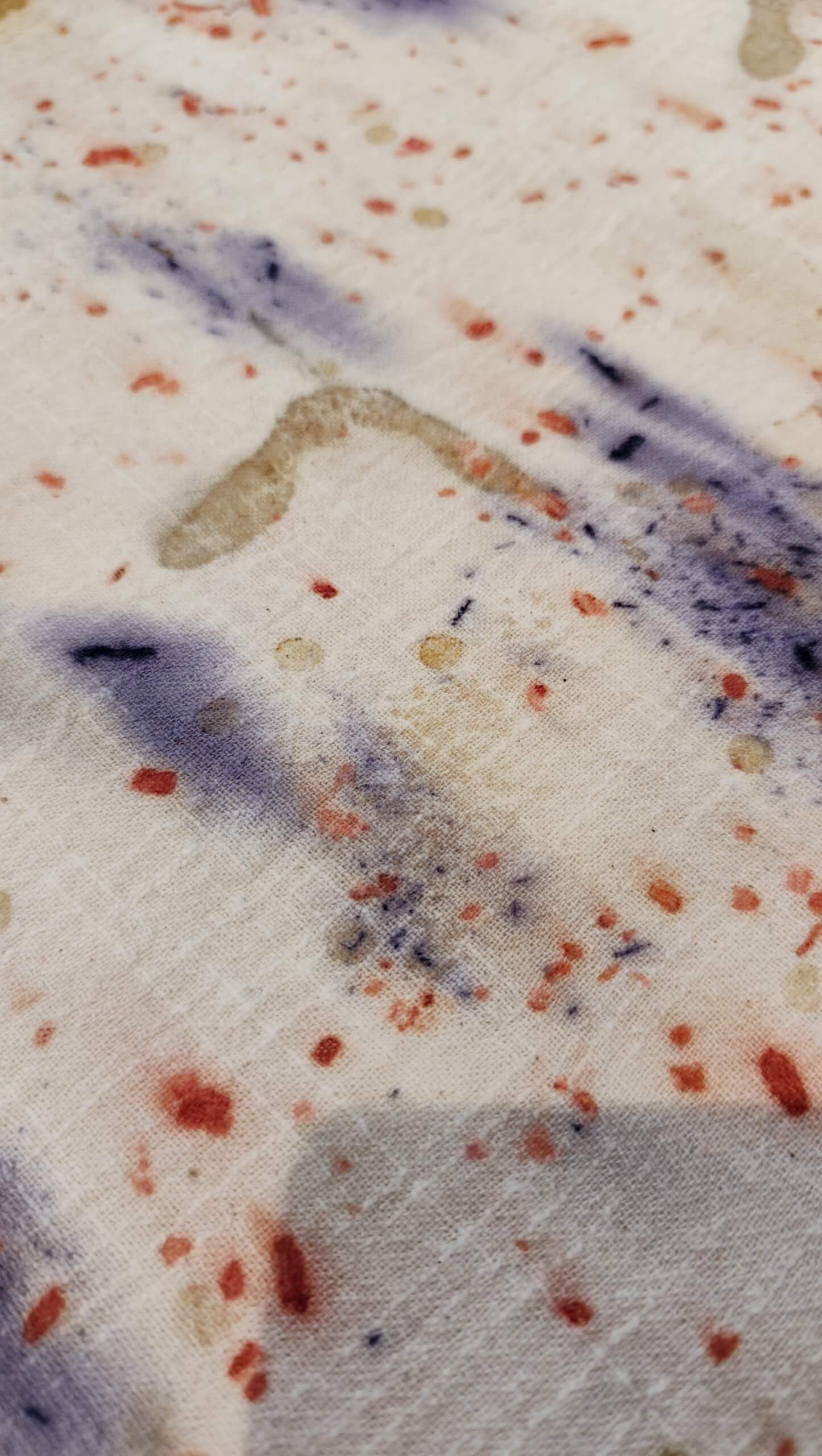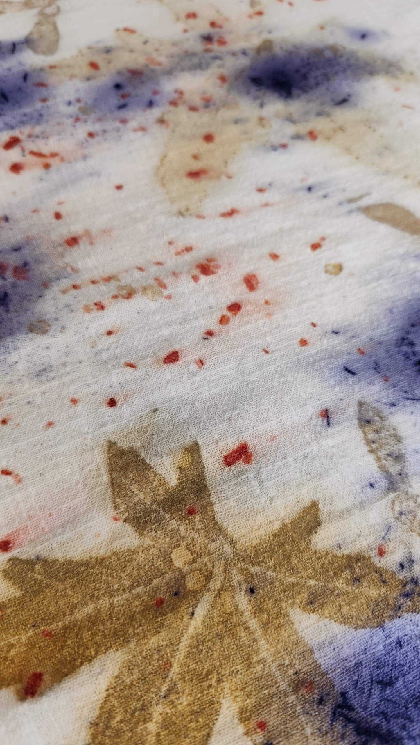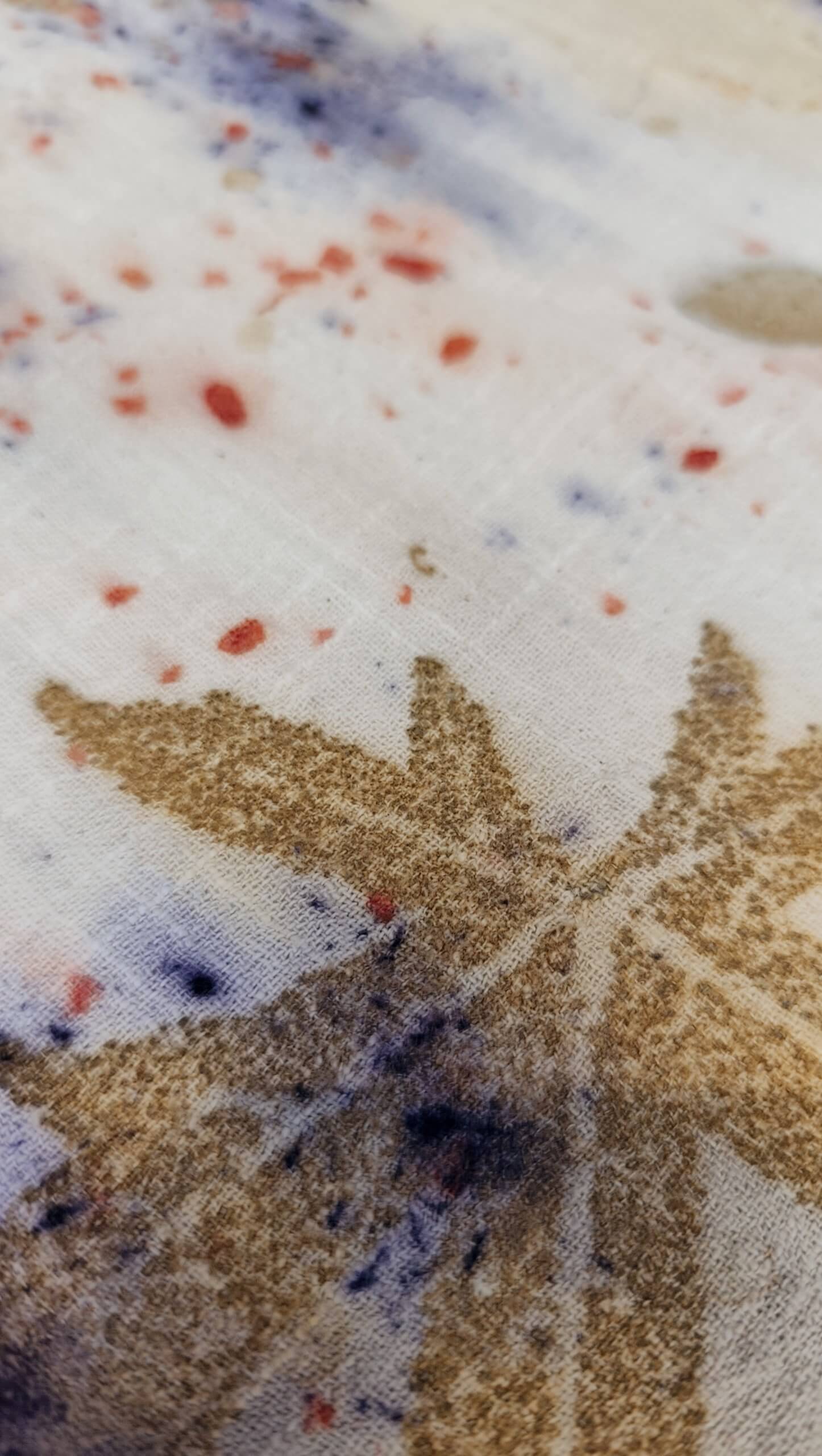 Este fular estampado con diversos materiales naturales es mucho más que un simple fular, es un trozo de arte creado por la naturaleza. Está estampado a mano con hojas, semillas, e incluso trozos de cortezas y raíces, que son las que le dan precisamente esos tonos morados y rojos tan llamativos.