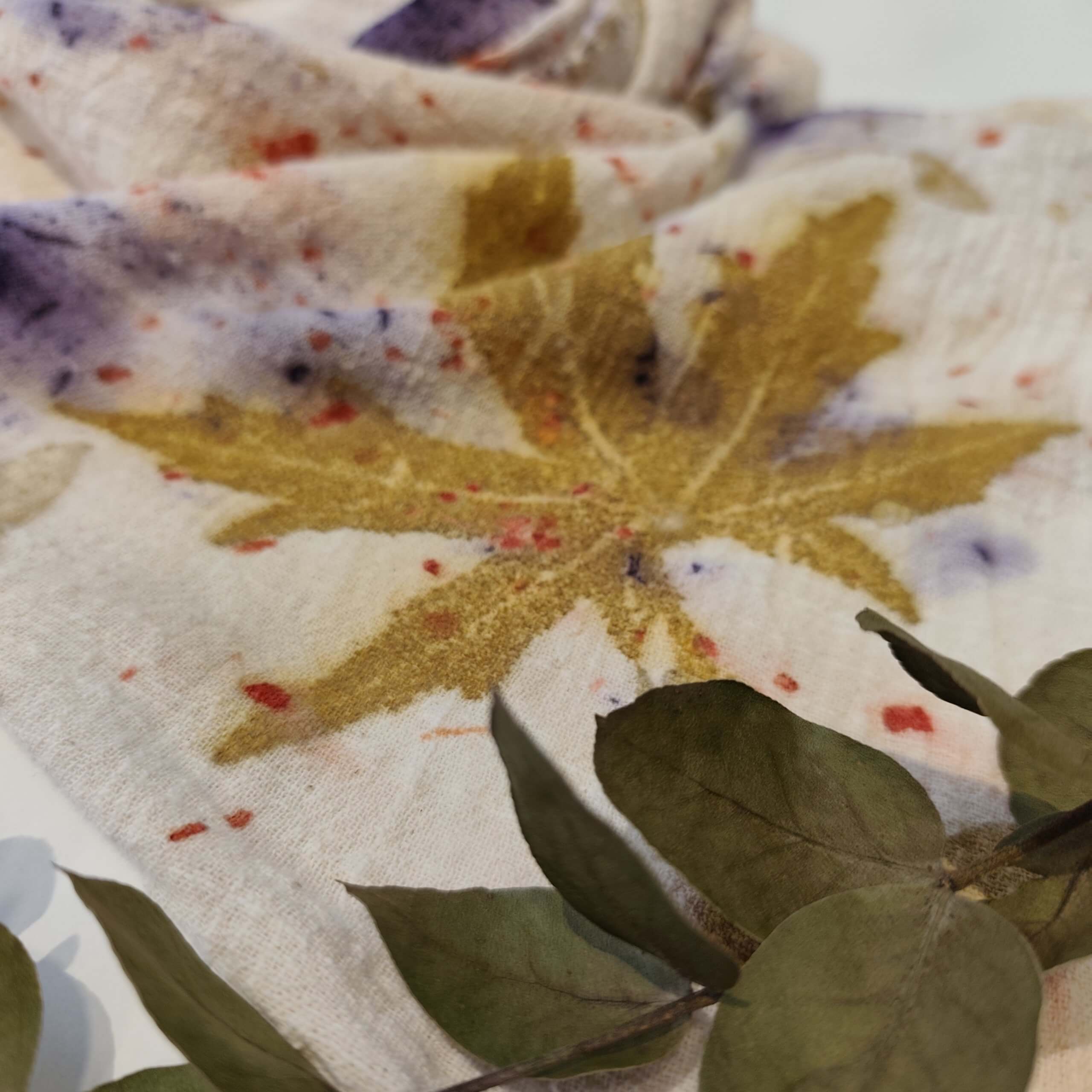 Por su tamaño (45 x 150 cm aprox) puedes llevarlo alrededor del cuello, sobre los hombros como chal, anudarlo en el cabello o incluso utilizarlo como cinturón decorativo. Cada vez que lo uses, estarás contando una historia distinta: la historia de las hojas que dejaron su huella, del bosque que inspiró su paleta y del proceso artesanal que lo convirtió en una prenda única.