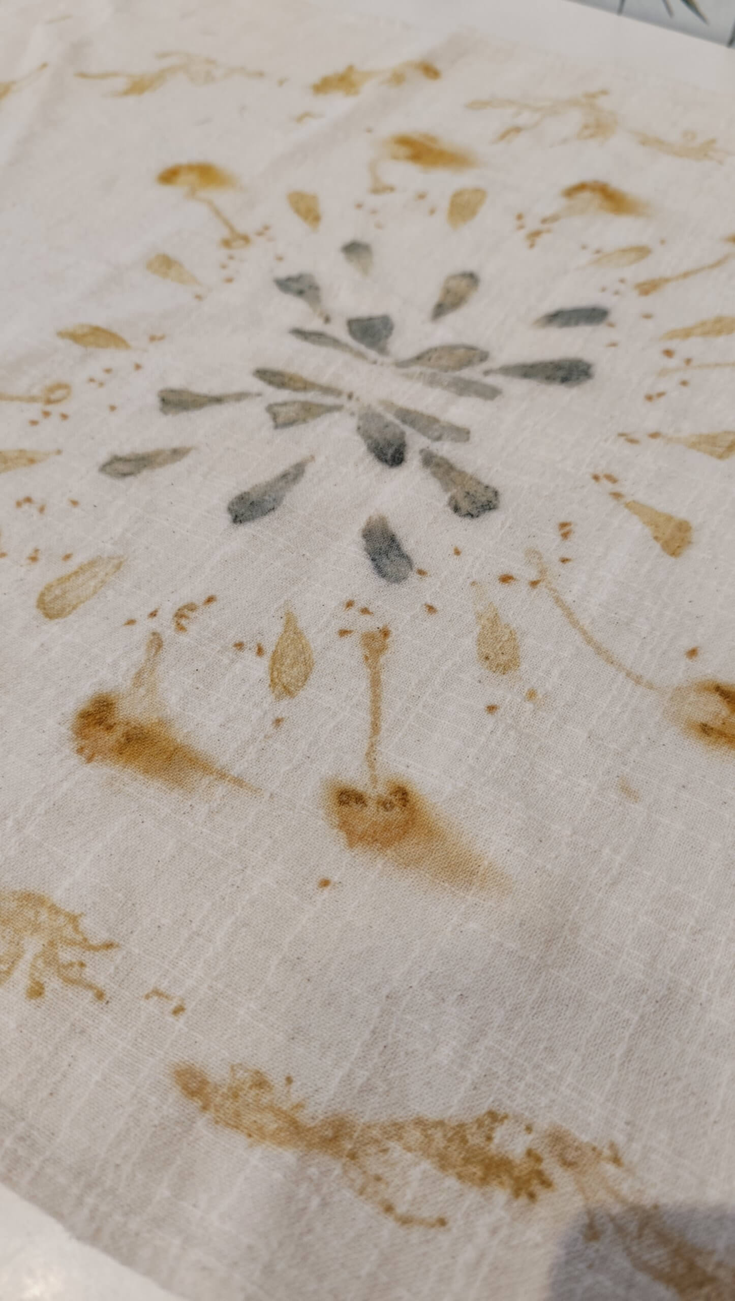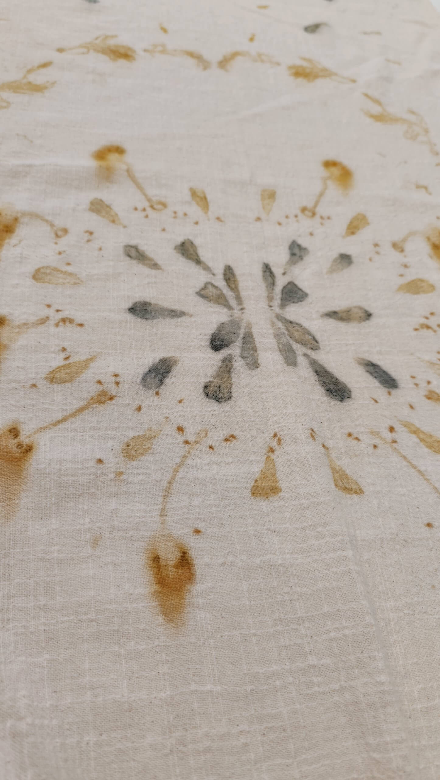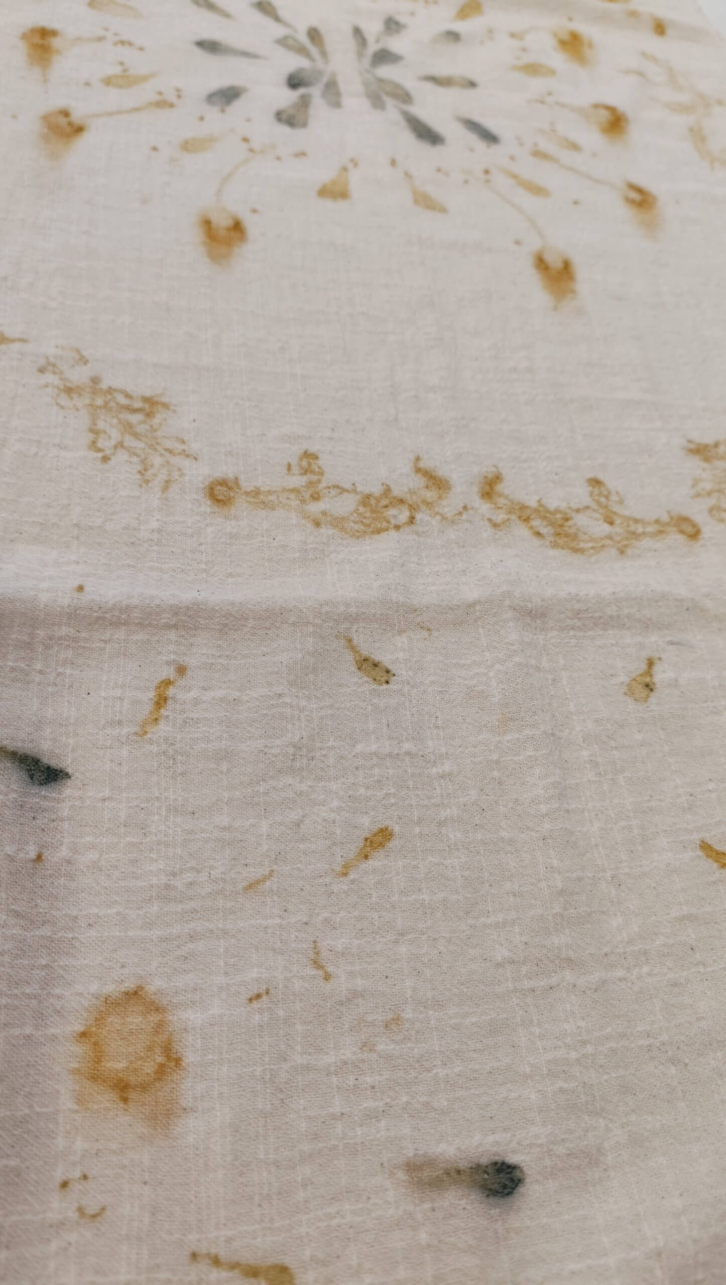 Chal estampado de forma artesanal, con pétalos azules y con hojas en tonos amarillos y verdes, con una apariencia delicada que combina a la perfección con tus vaqueros o con un abrigo de paño azul.